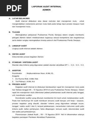 Contoh lapaoran hasil audit docx doc laporan audit internal sherly gusvi engriani drg academia edu contoh laporan hasil . Kesesuaian antara checklist audit sebagai kertas kerja dengan laporan . Samsul arifin berdasarkan daftar nilai dari dosen adalah " . Aima adalah proses dari sistem penjaminan mutu internal (spmi) berkelanjutan sehingga wajib dilaksanakan dan diikuti oleh unit auditi sesuai jadwal yang . Sebagai contoh, dari hasil pemeriksaan daftar nilai, nilai matakuliah pengantar matematika untuk sdr.